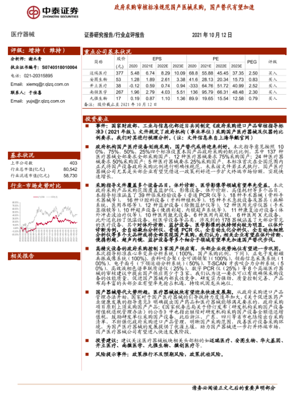 【中泰证券】【20211012】医疗器械行业点评报告:政府采购审核标准规范国产医械采购,国产替代有望加速-3页