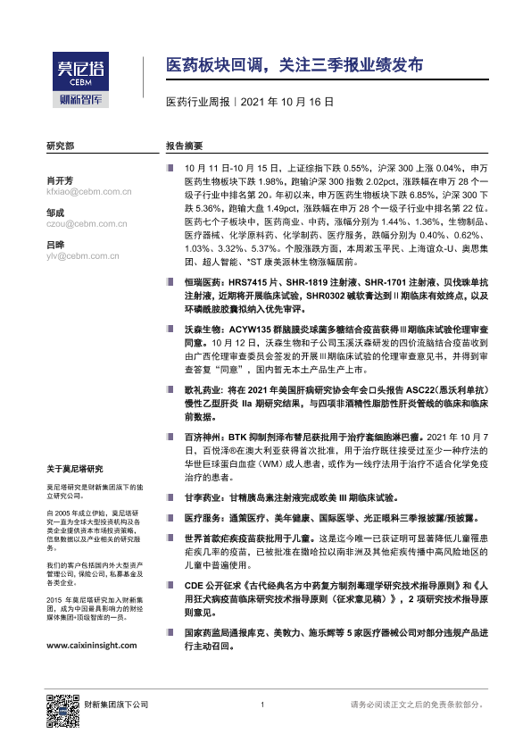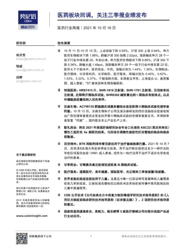 【莫尼塔研究】【20211016】医药行业周报:医药板块回调,关注三季报业绩发布-9页