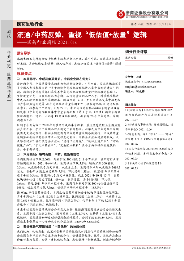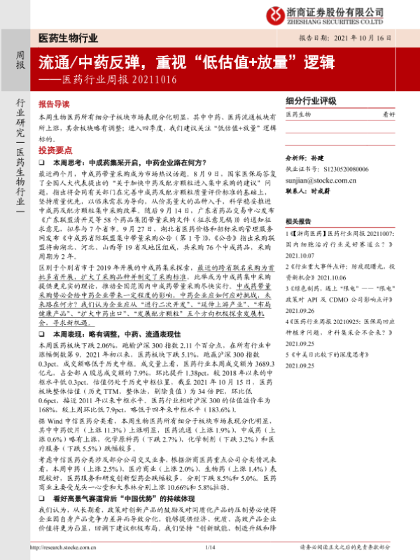 【浙商证券】【20211016】医药行业周报:流通中药反弹,重视“低估值+放量”逻辑-14页