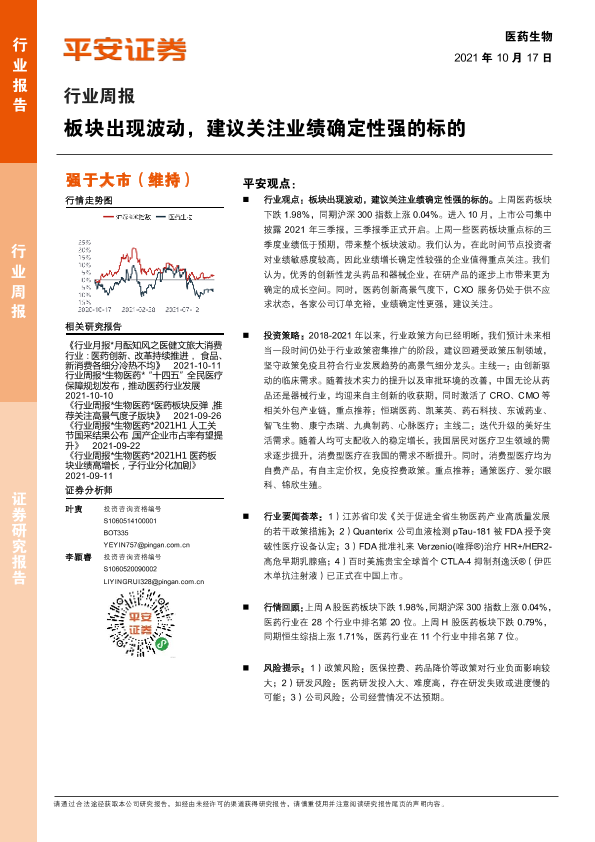 【平安证券】【20211017】医药生物行业周报:板块出现波动,建议关注业绩确定性强的标的-5页