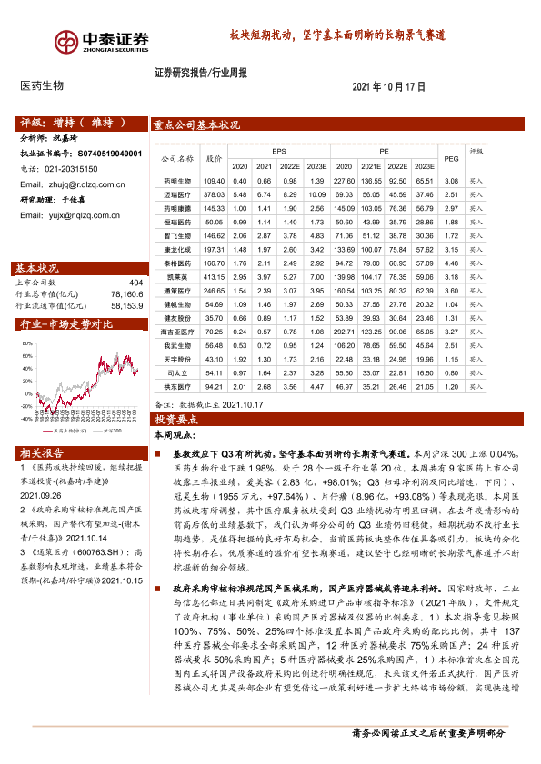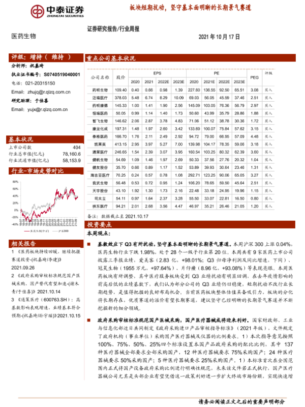 【中泰证券】【20211017】医药生物行业周报:板块短期扰动,坚守基本面明晰的长期景气赛道-15页