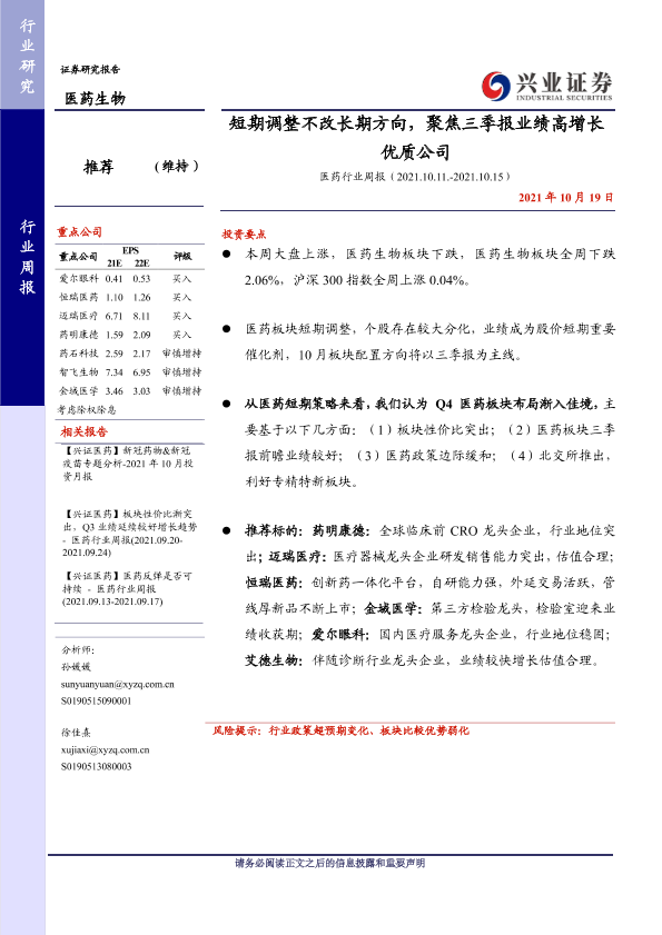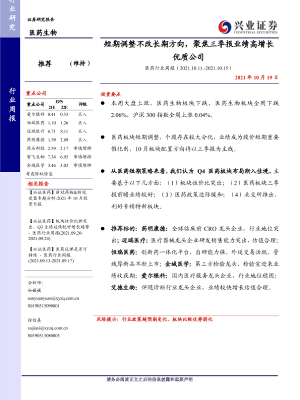【兴业证券】【20211019】医药行业周报:短期调整不改长期方向,聚焦三季报业绩高增长优质公司-12页