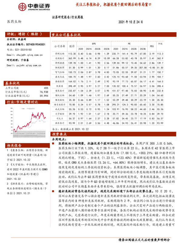 三季报 医疗服务 医药生物 投资机会 疫苗