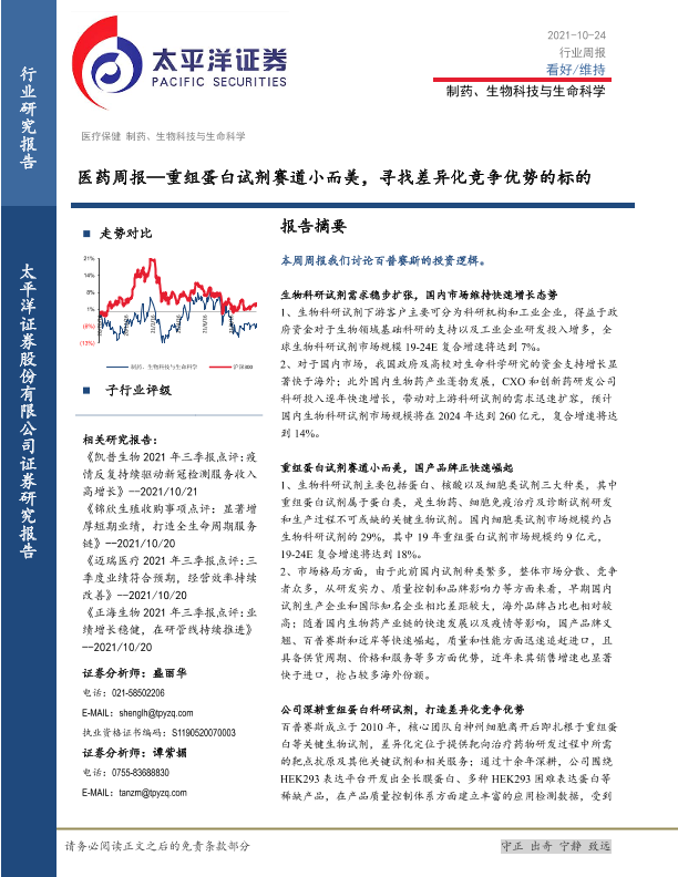 【太平洋证券】【20211024】医药周报:重组蛋白试剂赛道小而美,寻找差异化竞争优势的标的-23页