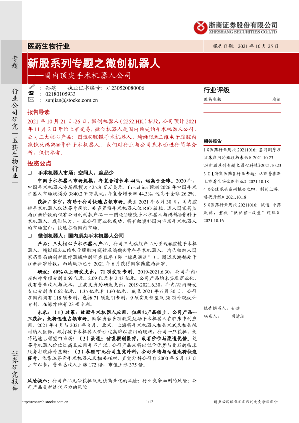 【浙商证券】【20211025】新股系列专题之微创机器人-12页