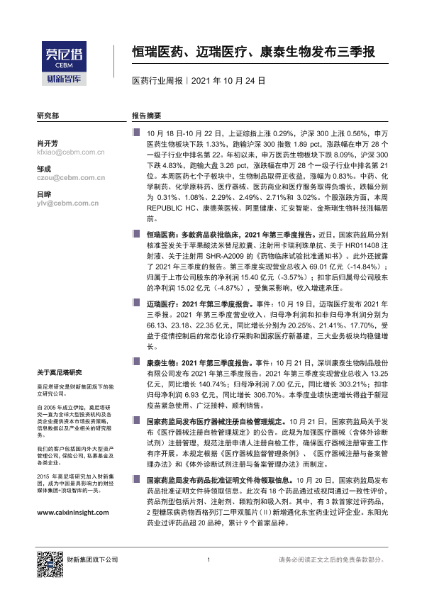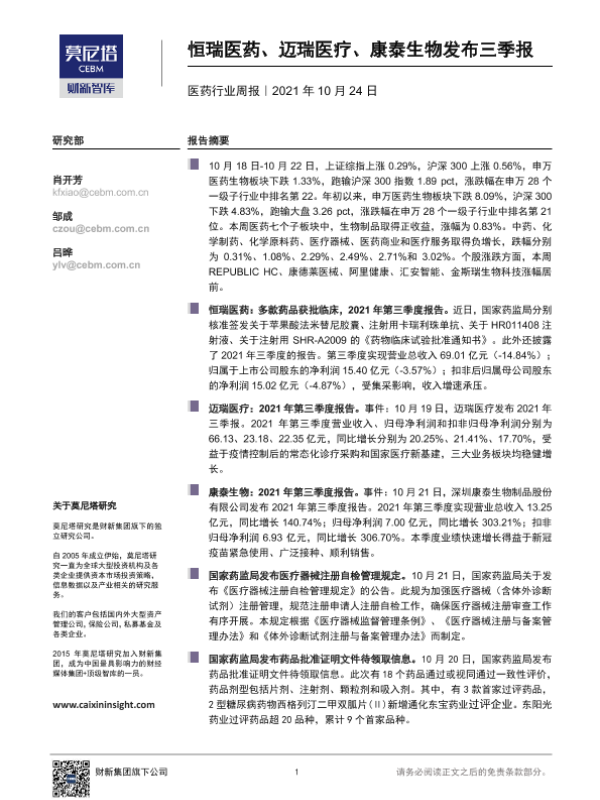 【莫尼塔研究】【20211024】医药行业周报:恒瑞医药、迈瑞医疗、康泰生物发布三季报-8页