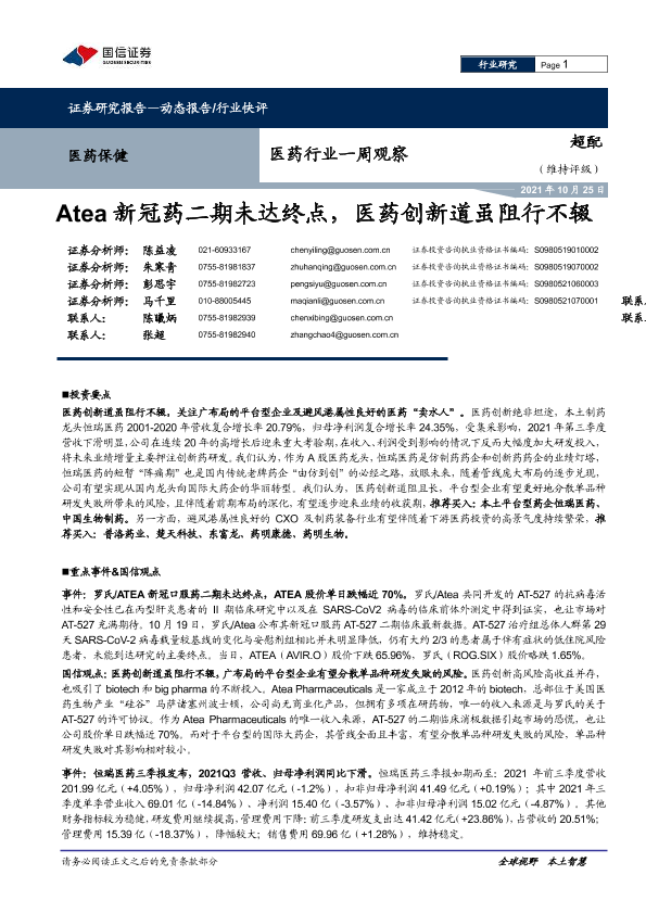 【国信证券】【20211025】医药行业一周观察:Atea新冠药二期未达终点,医药创新道虽阻行不辍-12页