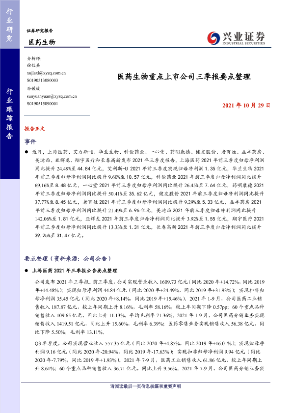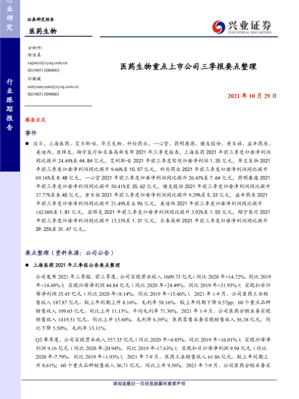 【兴业证券】【20211029】医药生物行业跟踪报告:药生物重点上市公司三季报要点整理-8页