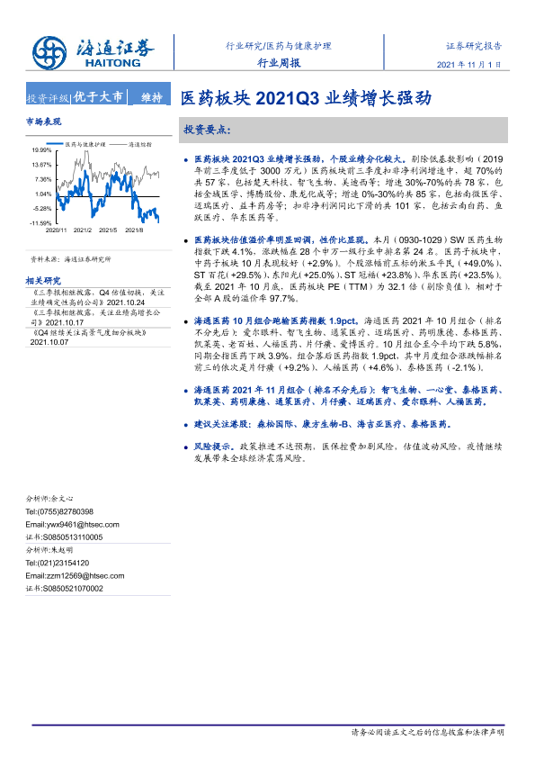 【海通证券】【20211101】医药与健康护理行业周报:医药板块2021Q3业绩增长强劲-5页