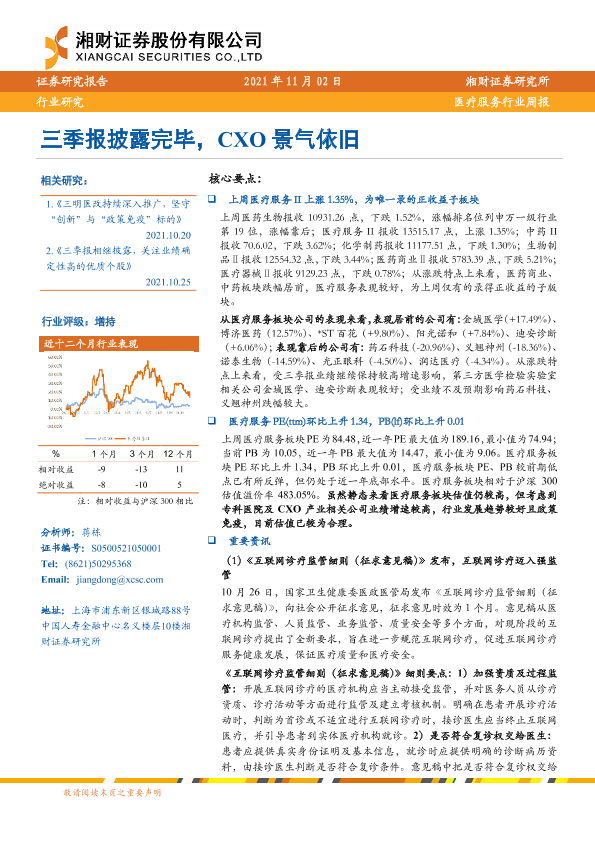 CXO 三季报 互联网诊疗监管 医疗服务 医药生物