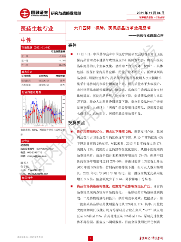 【国融证券】【20211104】医药行业跟踪点评:六升四降一保障,医保药品改革效果显著-3页