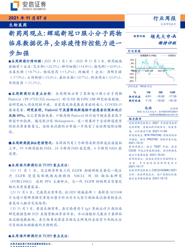 【安信证券】【20211107】新药周观点:辉瑞新冠口服小分子药物临床数据优异,全球疫情防控能力进一步加强-16页