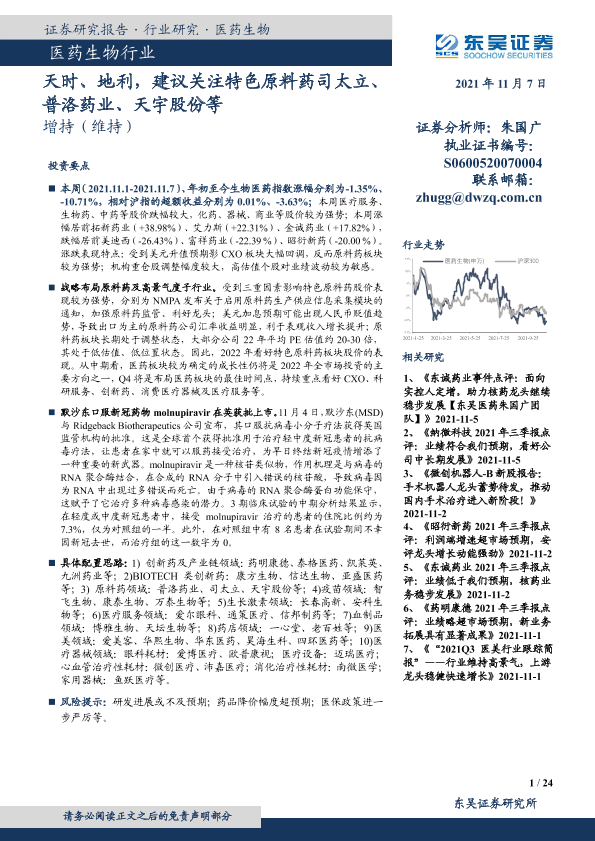 【东吴证券】【20211107】医药生物行业研究:天时、地利,建议关注特色原料药司太立、普洛药业、天宇股份等-24页