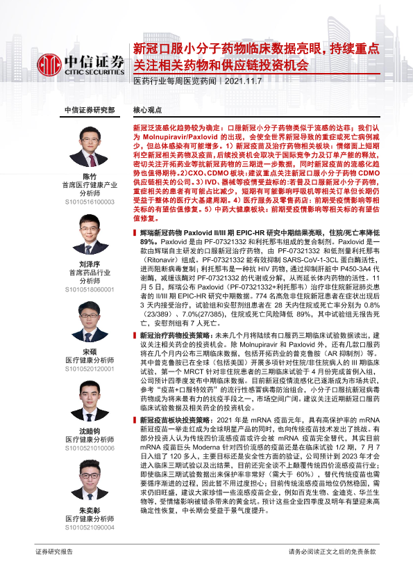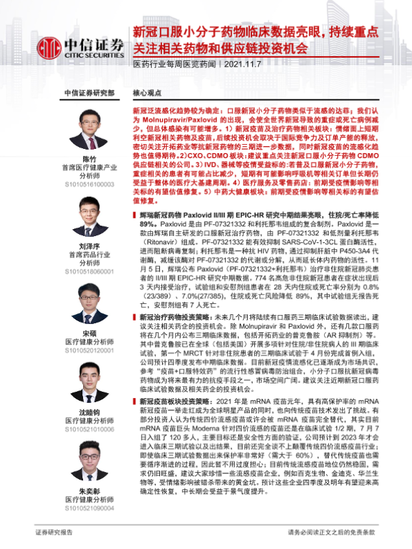 【中信证券】【20211107】医药行业每周医览药闻:新冠口服小分子药物临床数据亮眼,持续重点关注相关药物和供应链投资机会-27页