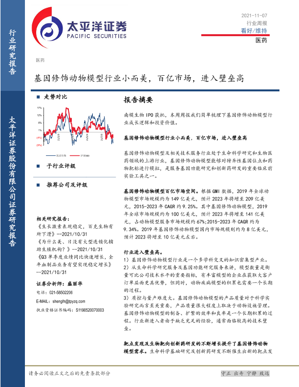 【太平洋证券】【20211107】医药行业周报:基因修饰动物模型行业小而美,百亿市场,进入壁垒高-24页