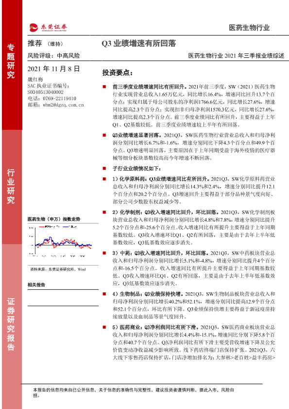 Q3业绩 业绩综述 东莞证券 医药生物 行业分析