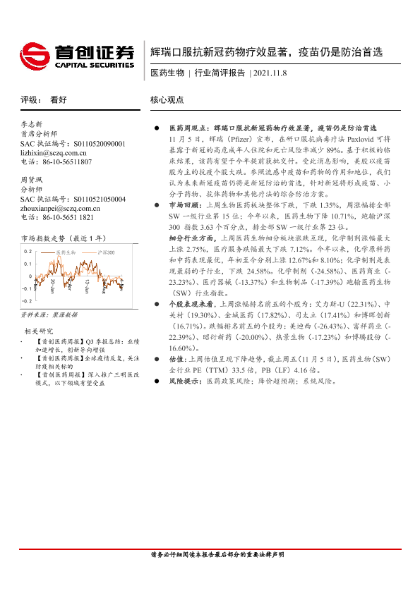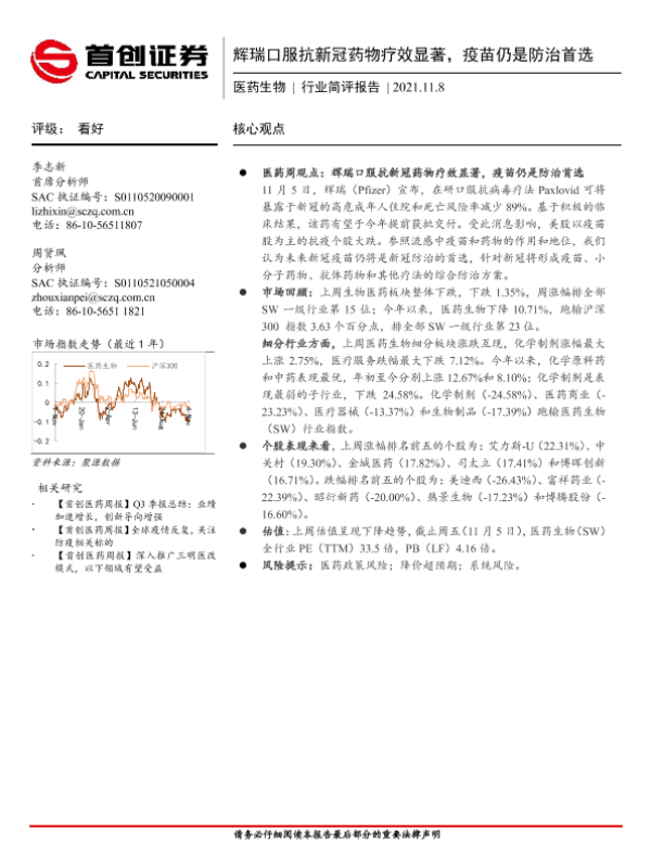 【首创证券】【20211108】医药生物行业简评报告:辉瑞口服抗新冠药物疗效显著,疫苗仍是防治首选-10页
