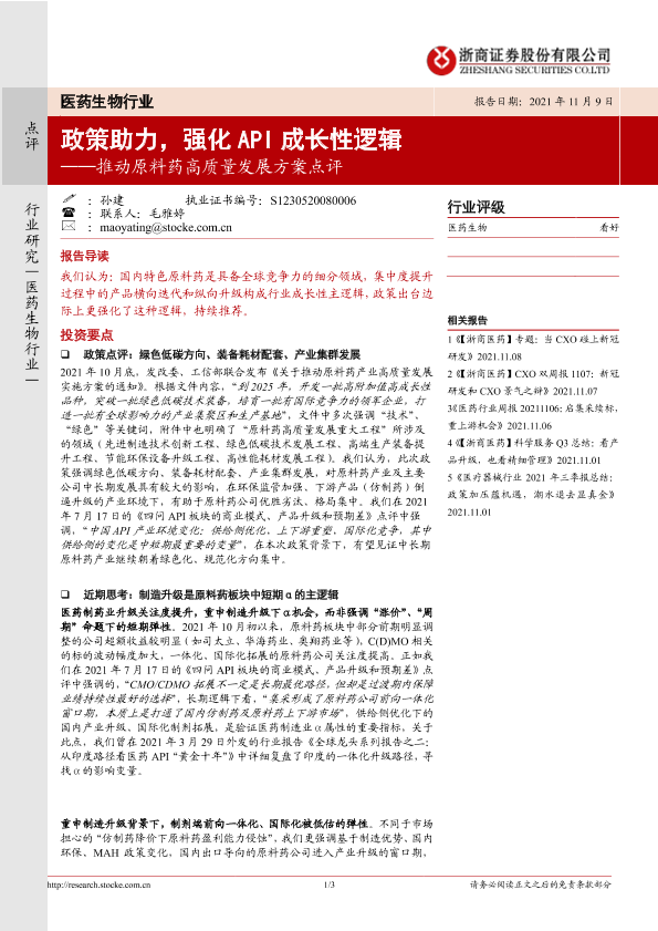【浙商证券】【20211109】推动原料药高质量发展方案点评:政策助力,强化API成长性逻辑-3页