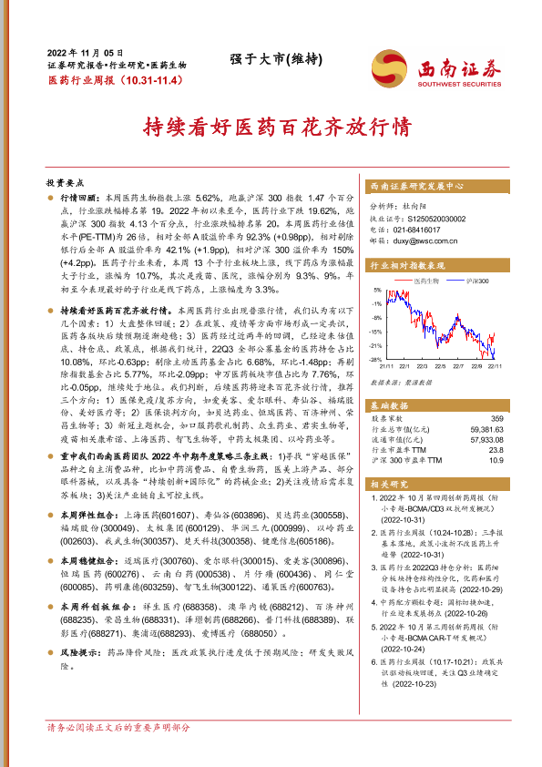 【西南证券】【20221105】医药行业周报:持续看好医药百花齐放行情-38页