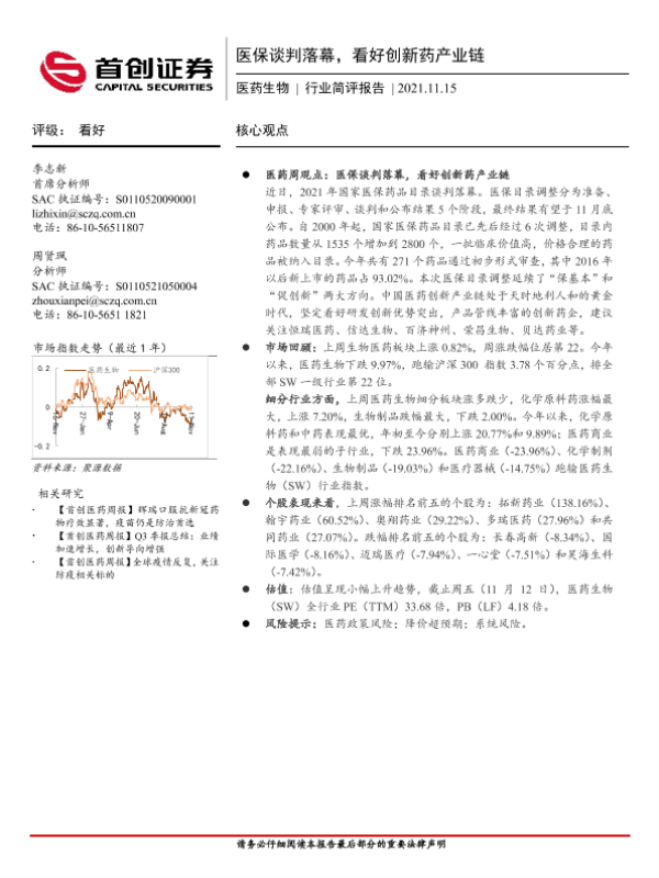 【首创证券】【20211115】医药生物行业简评报告:医保谈判落幕,看好创新药产业链-9页