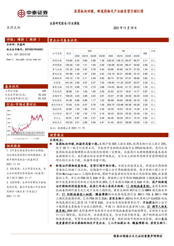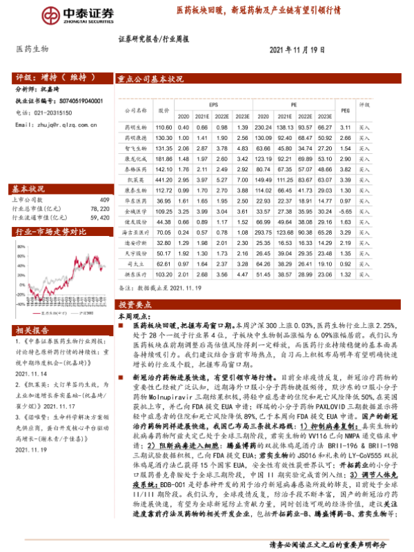 【中泰证券】【20211119】医药生物行业周报:医药板块回暖,新冠药物及产业链有望引领行情-11页