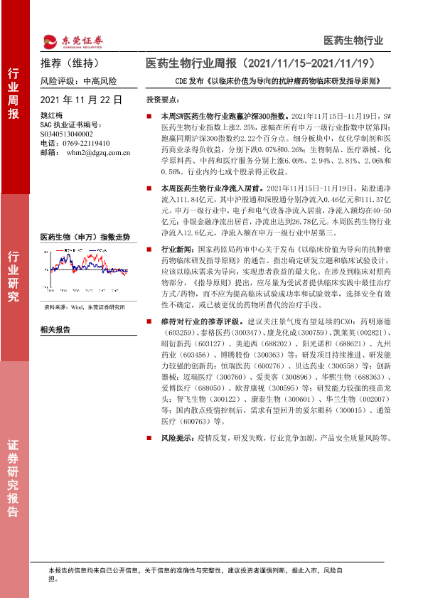 【东莞证券】【20211122】医药生物行业周报:CDE发布《以临床价值为导向的抗肿瘤药物临床研发指导原则》-10页