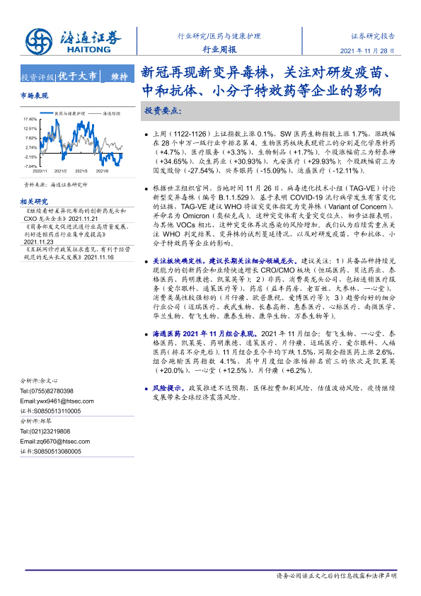 【海通证券】【20211128】医药与健康护理行业周报:新冠再现新变异毒株,关注对研发疫苗、中和抗体、小分子特效药等企业的影响-5页