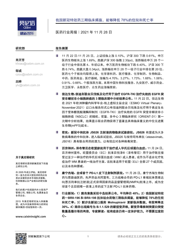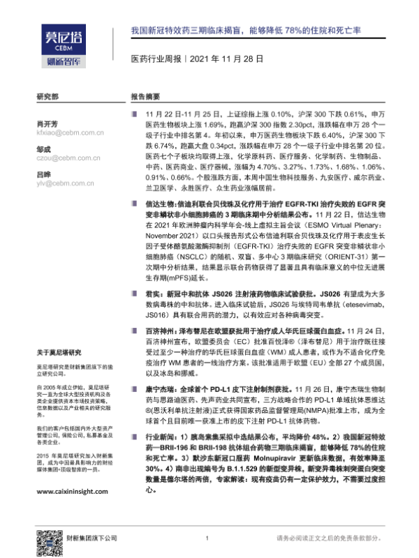 【莫尼塔研究】【20211128】我国新冠特效药三期临床揭盲,能够降低78%的住院和死亡率-9页