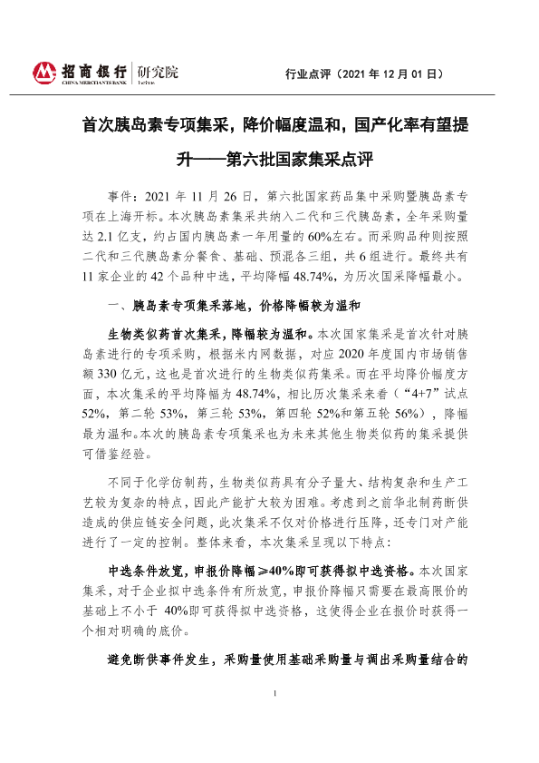 【招商银行】【20211201】第六批国家集采点评-首次胰岛素专项集采,降价幅度温和,国产化率有望提升-6页