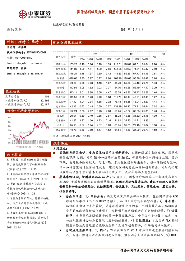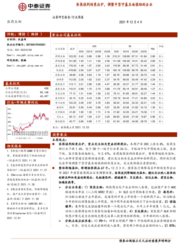 【中泰证券】【20211204】医药生物行业周报:医保谈判结果出炉,调整中坚守基本面强劲的企业-12页