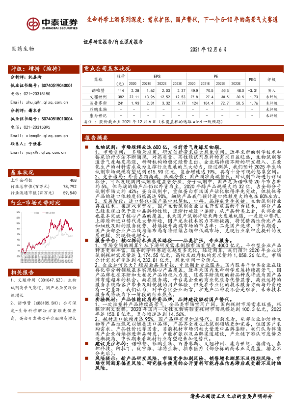 【中泰证券】【20211206】医药生物行业深度报告:生命科学上游系列深度:需求扩张、国产替代,下一个5-10年的高景气大赛道-38页