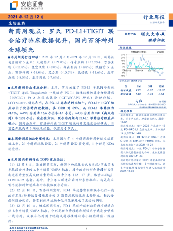 【安信证券】【20211212】新药周观点:罗氏PD-L1+TIGIT联合治疗临床数据优异,国内百济神州全球领先-14页