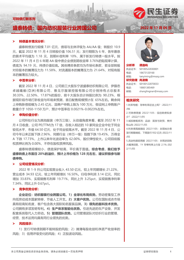 【民生证券】【20221106】可转债打新系列:盛泰转债,国内纺织服装行业跨国公司-15页
