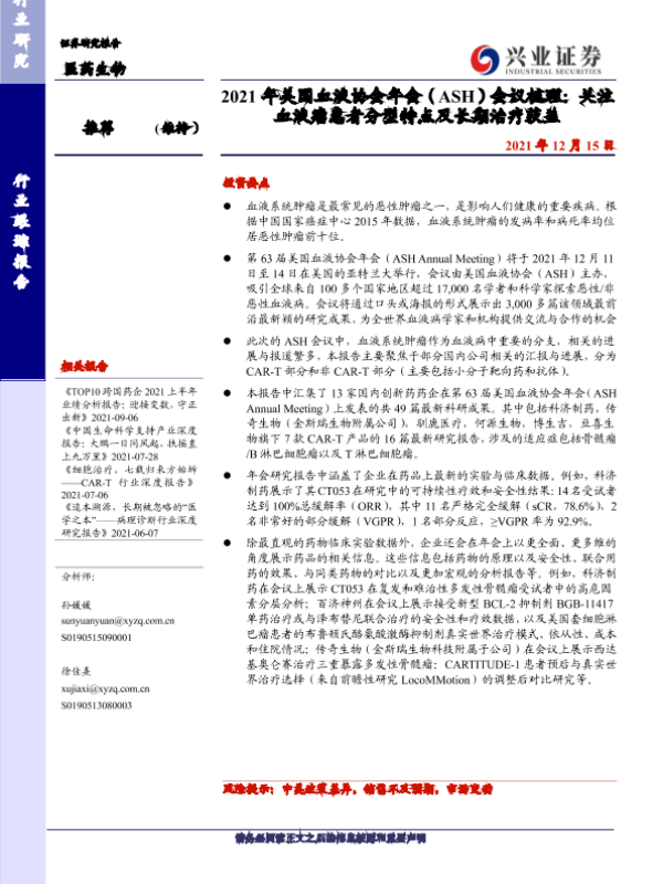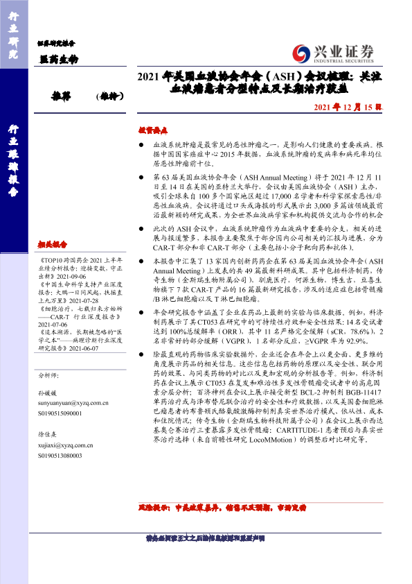 【兴业证券】【20211215】2021年美国血液协会年会(ASH)会议梳理:关注血液瘤患者分型特点及长期治疗获益-60页