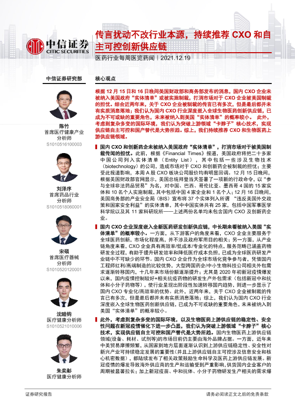 【中信证券】【20211219】医药行业每周医览药闻:传言扰动不改行业本源,持续推荐CXO和自主可控创新供应链-20页