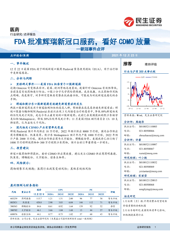 【民生证券】【20211223】医药:新冠事件点评:FDA批准辉瑞新冠口服药,看好CDMO放量-3页