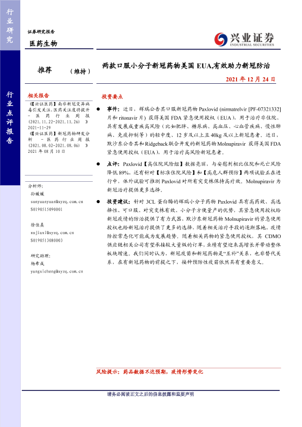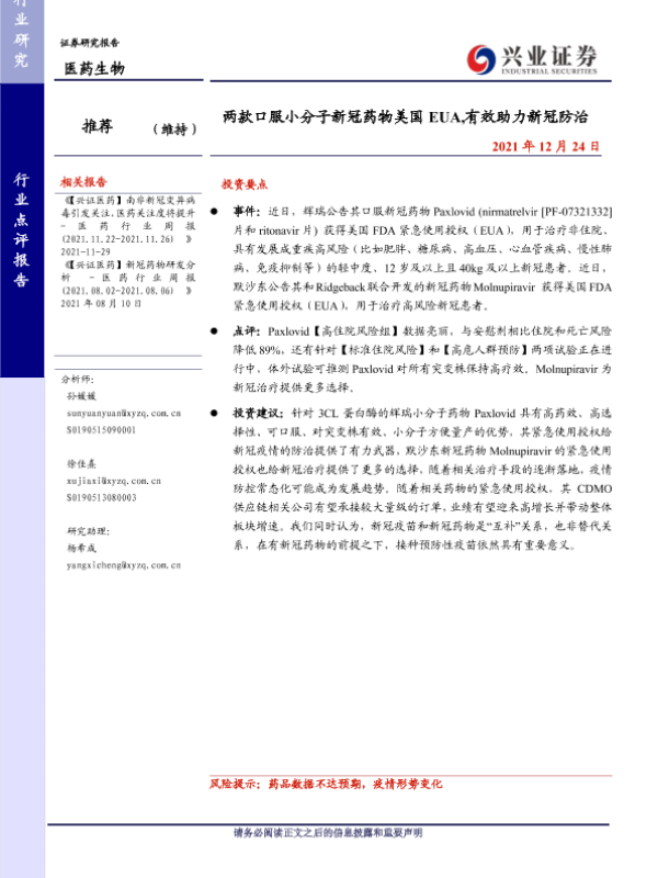 【兴业证券】【20211224】两款口服小分子新冠药物美国EUA,有效助力新冠防治-4页