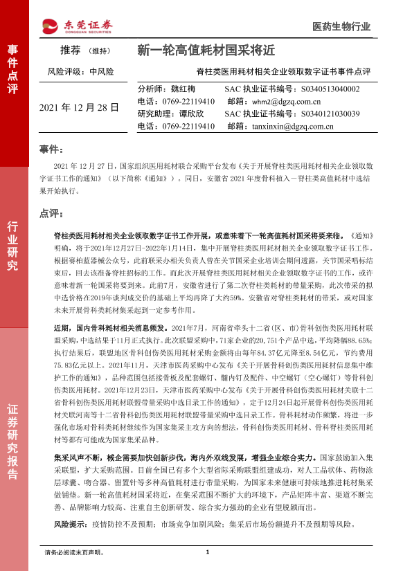 【东莞证券】【20211228】医药生物行业:脊柱类医用耗材相关企业领取数字证书事件点评-2页