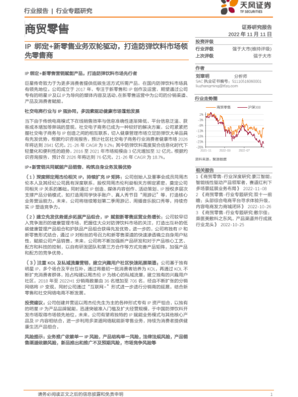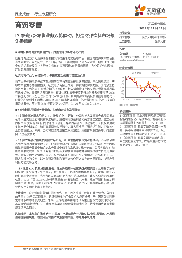 【天风证券】【20221111】商贸零售行业专题研究:IP绑定+新零售业务双轮驱动,打造防弹饮料市场领先零售商-20页