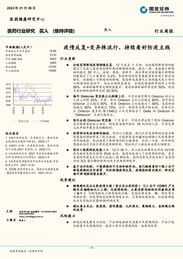 【国金证券】【20220109】医药行业研究:疫情反复+变异株流行,持续看好防疫主线-9页