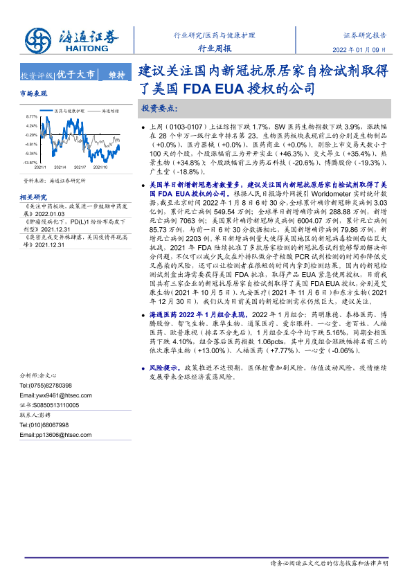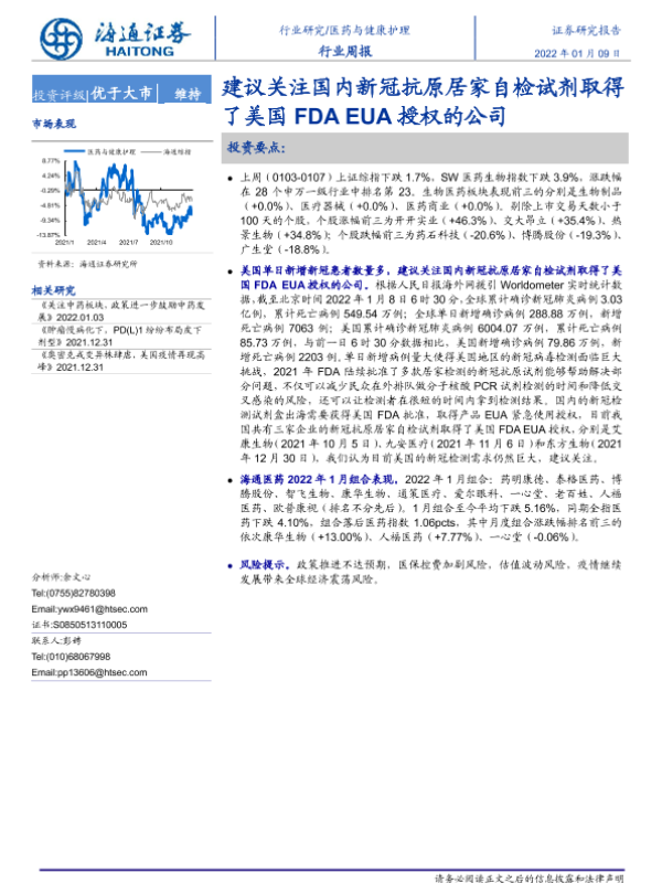 【海通证券】【20220109】医药与健康护理行业周报:建议关注国内新冠抗原居家自检试剂取得了美国FDA EUA授权的公司-5页