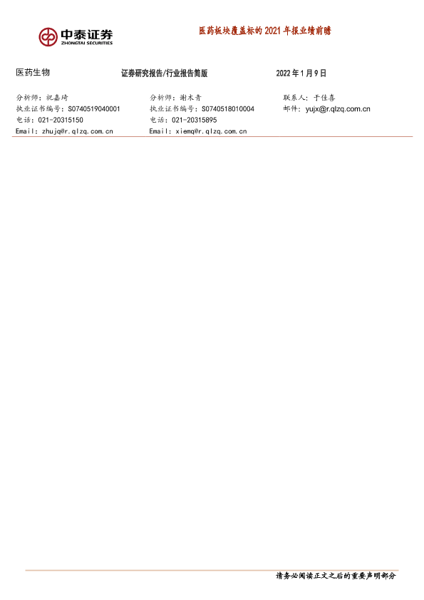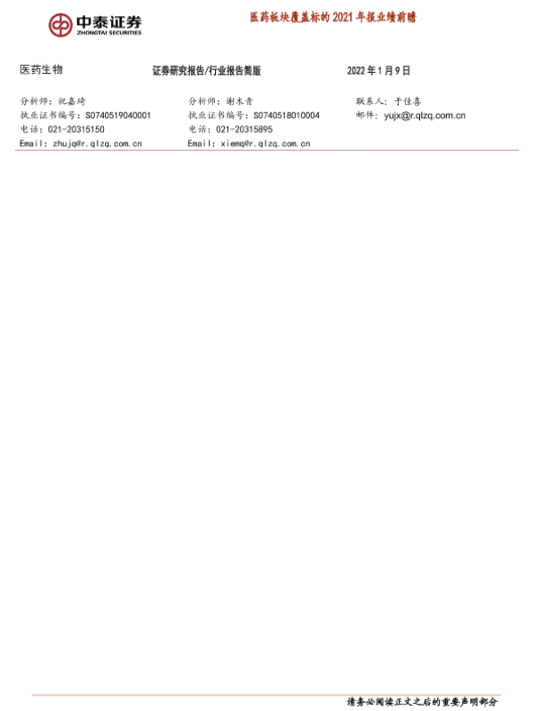 【中泰证券】【20220109】医药板块覆盖标的2021年报业绩前瞻-4页
