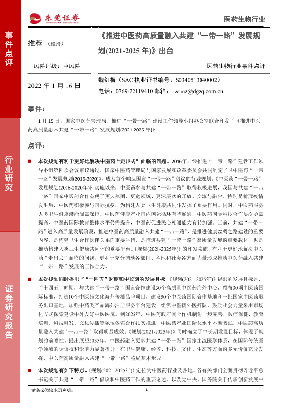 【东莞证券】【20220116】推进中医药高质量融入共建'一带一路'发展规划(2021-2025年)出台-3页
