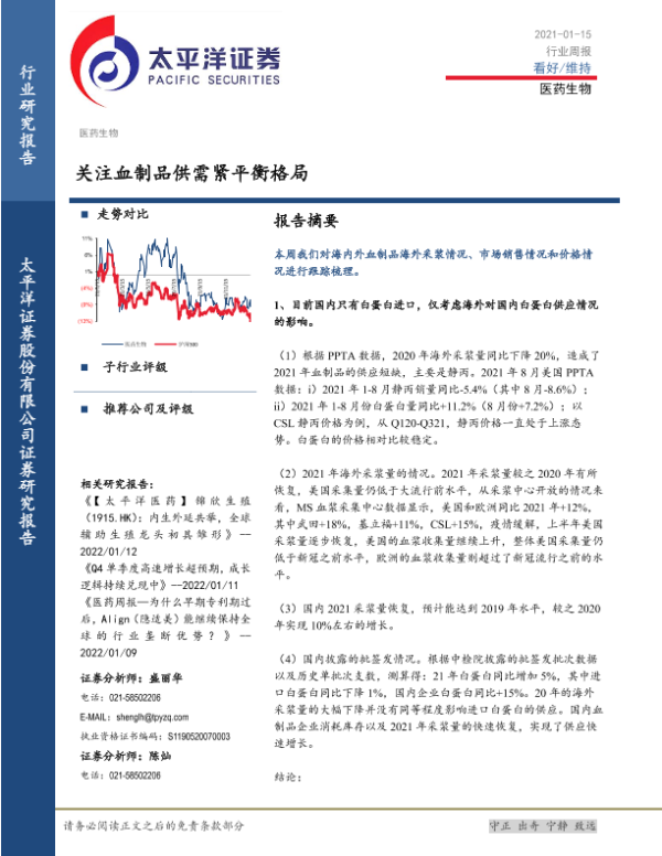 【太平洋证券】【20220115】关注血制品供需紧平衡格局-18页