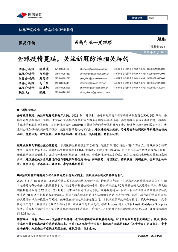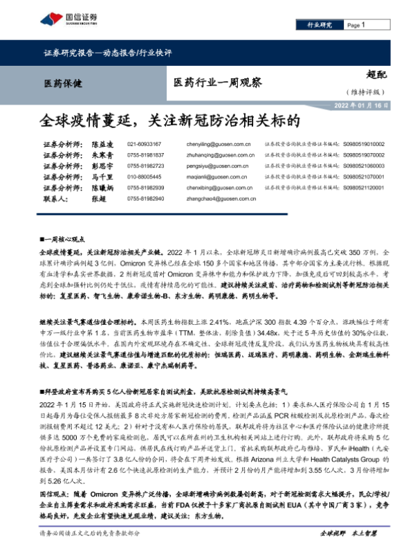 【国信证券】【20220116】医药行业一周观察:全球疫情蔓延,关注新冠防治相关标的-11页