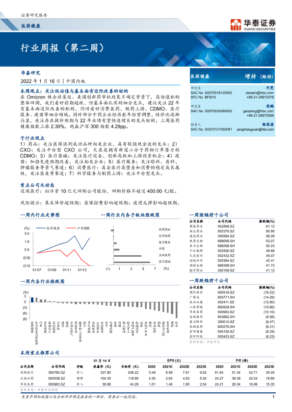 医药健康 华泰证券 市场分析 投资建议 行业周报