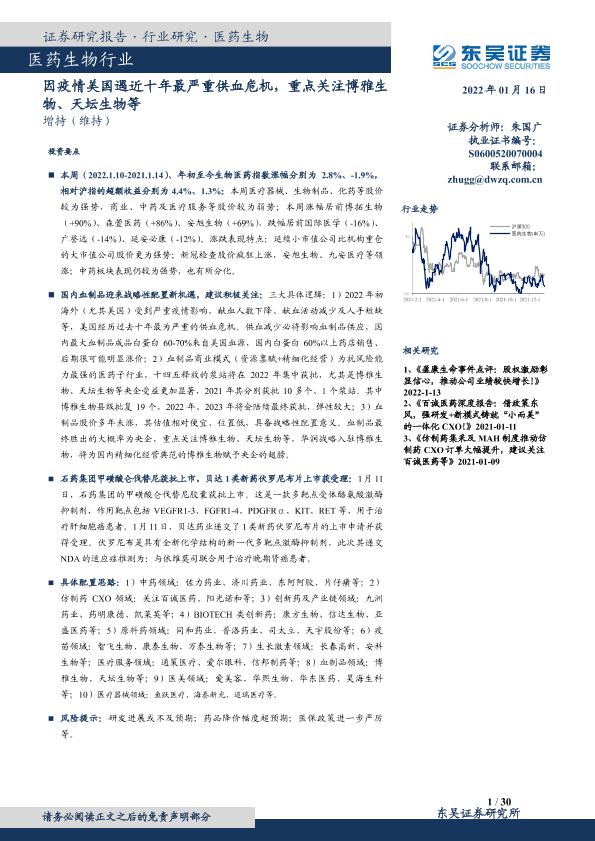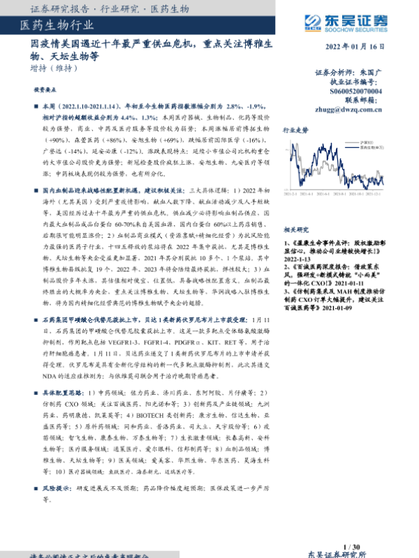 【东吴证券】【20220116】医药生物行业跟踪周报:因疫情美国遇近十年最严重供血危机,重点关注博雅生物、天坛生物等-30页