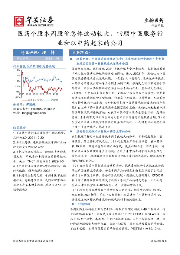 【华安证券】【20220116】生物医药行业周报:医药个股本周股价总体波动较大,回顾中医服务行业和以中药起家的公司-21页