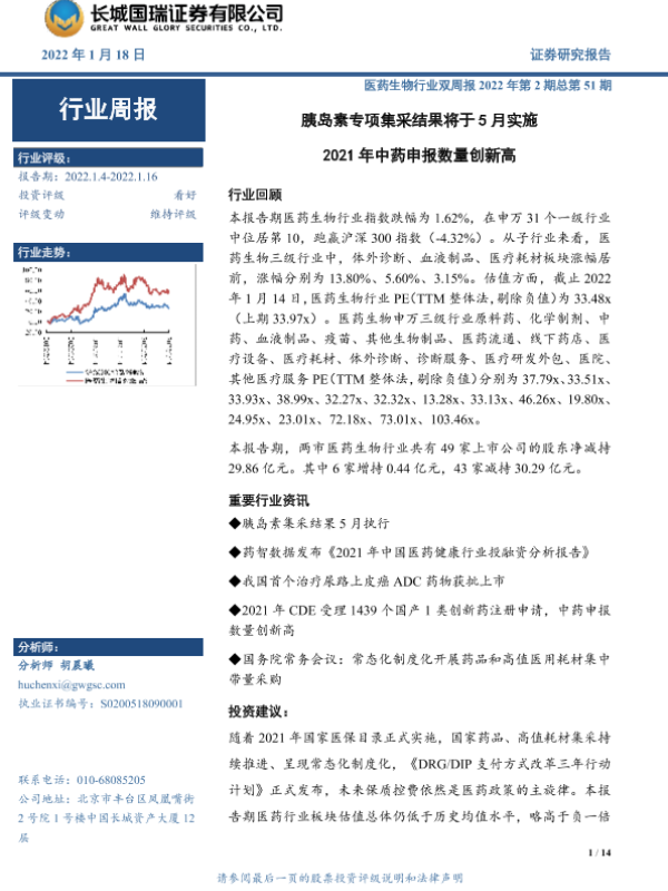 【长城国瑞证券】【20220118】医药生物行业双周报2022年第2期总第51期:胰岛素专项集采结果将于5月实施 2021年中药申报数量创新高-14页