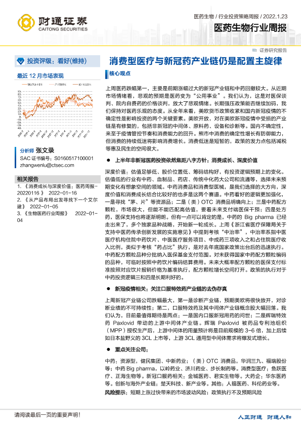 【财通证券】【20220123】医药生物行业周报:消费型医疗与新冠药产业链仍是配置主旋律-12页